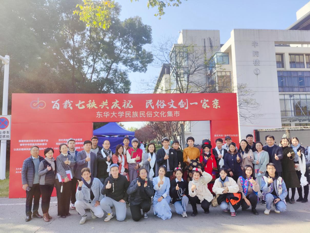 11月8日,由纺织学院、民族联等承办的“百载七秩共庆祝,民族团结一家亲”民族民俗文化集市在松江校区张謇广场、张謇小径开市。在张謇广场的幕墙上,展示了习近平总书记在2021年中央民族工作会议的重要讲话精神和学校各学院的民族团结进步教育工作,并展出了地校联合选送的民族民俗文创作品。来自维吾尔族、哈萨克族等16个民族的同学们通过节目表演、美食介绍、习俗文化展示等方式对民族文化进行集中展示宣传,在校园里营造了“民族团结一家亲”的浓厚氛围。