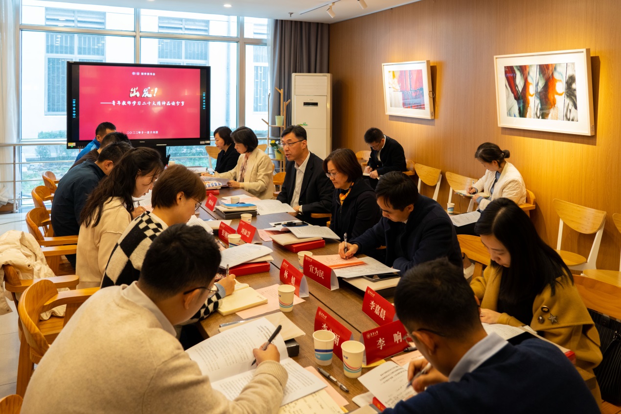 11月16日上午,在党的二十大隆重开幕一个月之际,一场生动热烈的品读分享活动在松江校区教工之家举行。来自不同单位、不同岗位的十位“青椒”围坐在方桌旁,手中捧着党的二十大报告原文,不停翻阅圈点,誊写笔记,聆听彼此的体悟和思考。